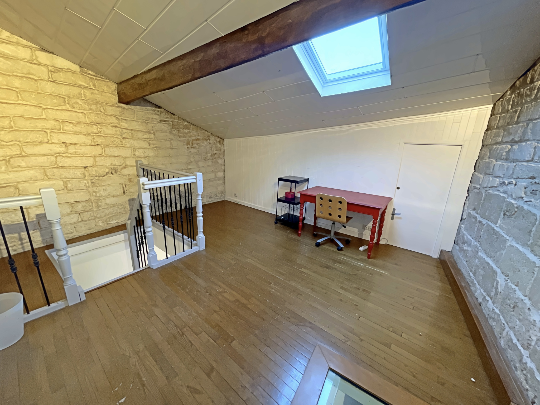 Il comprend une pièce de vie lumineuse avec cuisine équipée ouverte, une salle de bains, un WC, une chambre, et à l’étage un espace bureau ainsi qu’une seconde chambre.