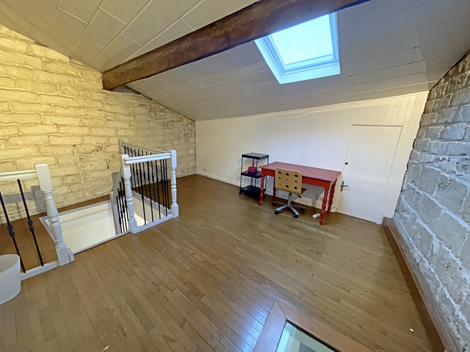 Il offre une pièce de vie lumineuse avec cuisine équipée ouverte, une salle de bain, un WC, deux chambres, et à l’étage, un espace bureau ainsi qu’une seconde chambre.