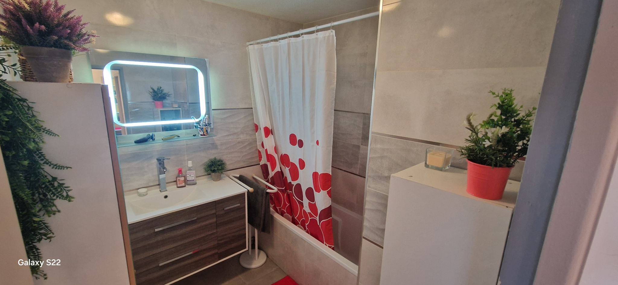 L’appartement se compose d’une chambre de 12 m², d’une salle de bain, d’un débarras, ainsi que d’un séjour spacieux de 19 m² ouvrant sur une terrasse de 11 m² avec vue dégagée exposée EST. Le chauffage est assuré par une chaudière au gaz installée il y a un an.